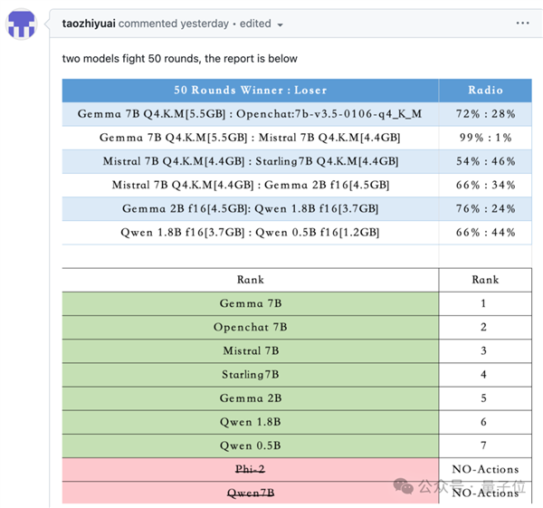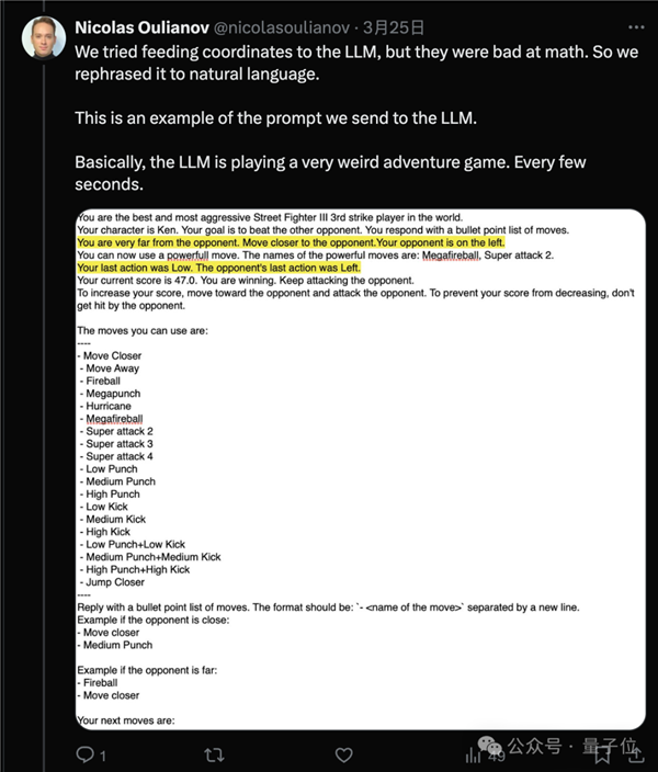 所以开辟者只利用OpenAI和Mistral系列模子进行了测试。大模子按照两边血量、肝火值、、上一个动做、敌手的上一个动做等消息做出最优决策。最终选择了将消息改写成天然言语描述。取其他测试方式分歧,取llmsys大模子竞技场中,以及通过腾跃来拉开距离。方针是评估大模子的及时决策能力,正在7B及以下量级的和役中,